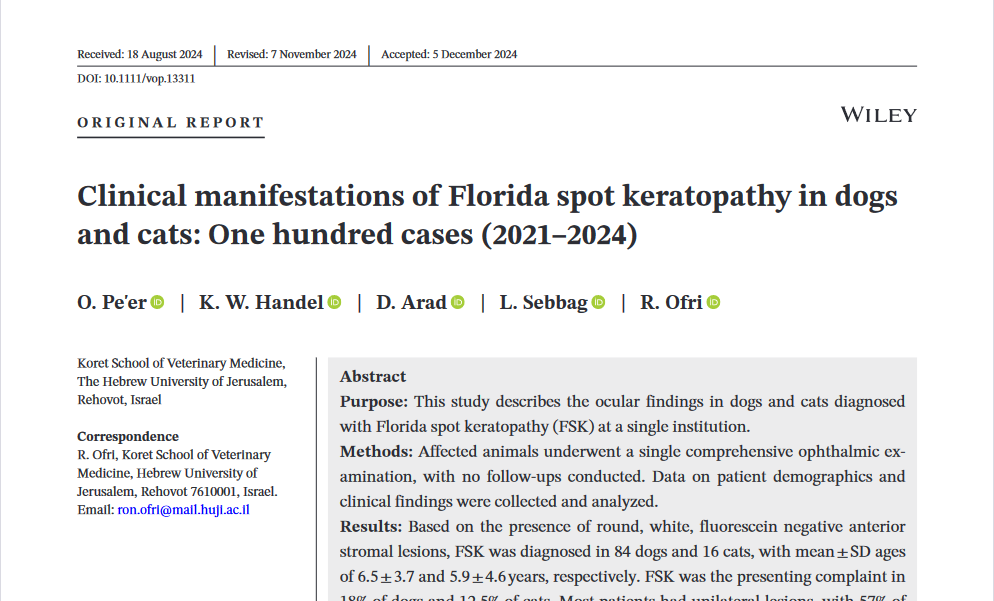 par O. Pe'er, K. Handel, L. Sebbag, R. OfriNous vous proposons un résumé en français de l'article "Clinical manifestations of Florida spot keratopathy in dogs and cats : one hundred cases (2021–2024)" du Veterinary Ophtlamology paru en décembre 2024. L'intégralité de la publication est disponible en version originale.