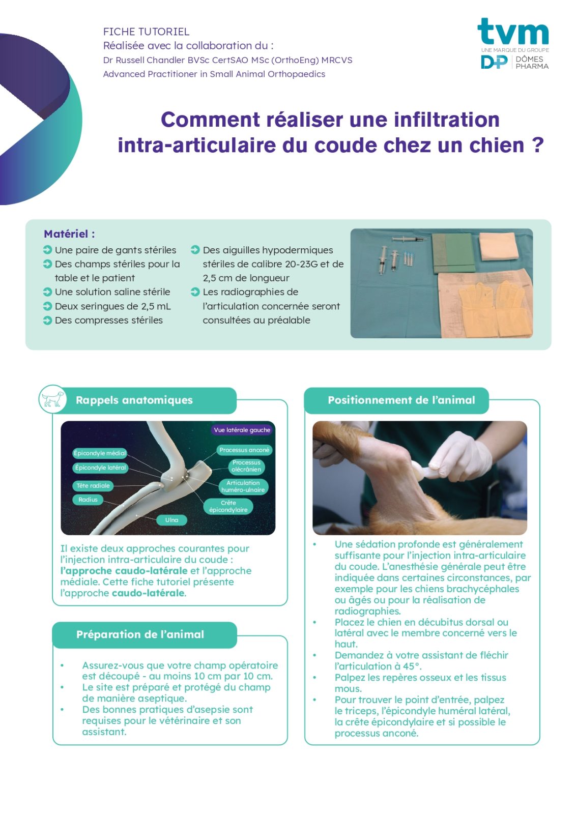 par C. RussellCette fiche pratique réalisée en collaboration avec le Dr Russell Chandler (BVSc CertSAO MSc (OrthoEng) MRCVS) reprend les différentes étapes : matériel, rappels anatomiques, positionnement/préparation de l’animal et techniques d’injection pour réaliser une infiltration intra-articulaire du coude chez un chien.