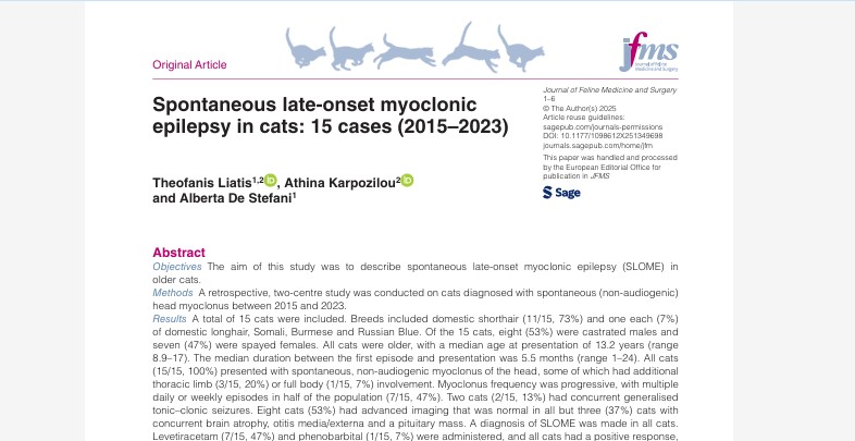 Résumé « Spontaneous late-onset myoclonic epilepsy in cats: 15 cases (2015-2023) »